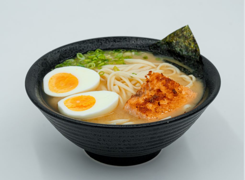 Japanese-style noodles in rich broth, topped with grilled salmon, soft-boiled egg, spring onion & nori